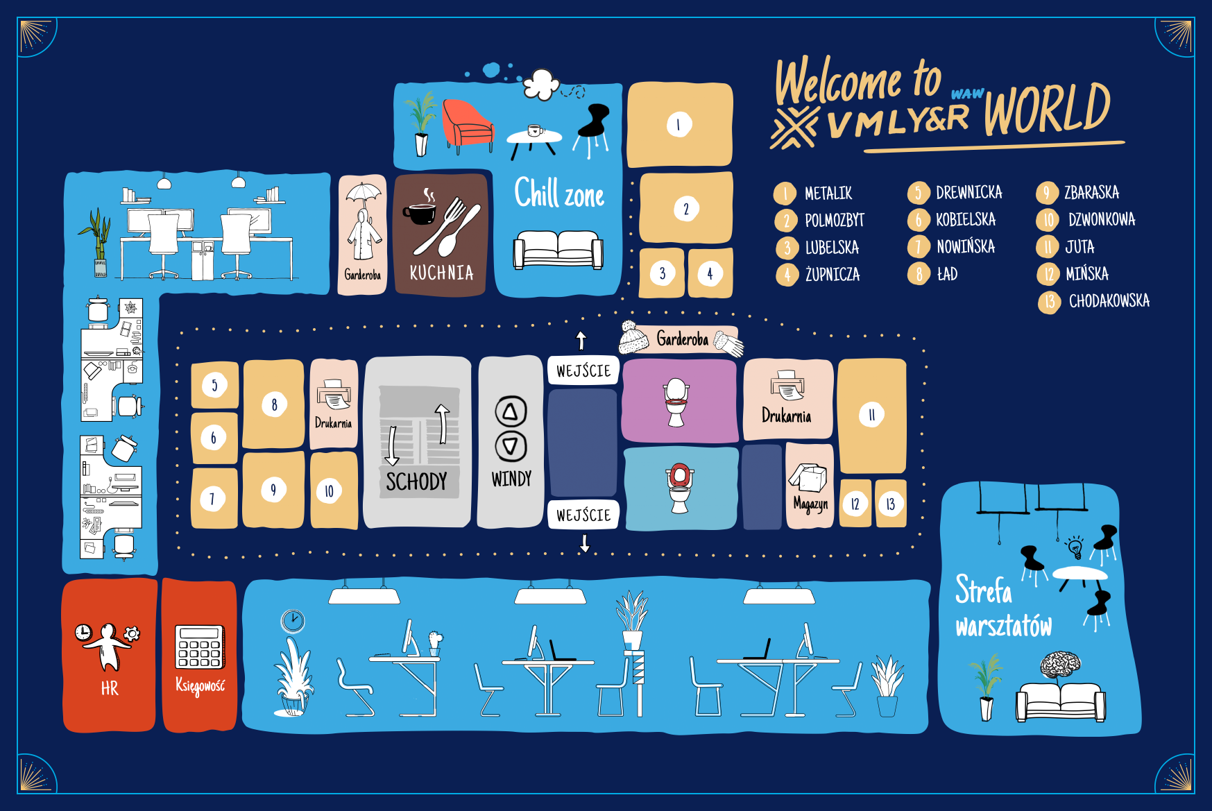 Co do zasady możemy siadać, gdzie chcemy na powierzchni, która jest dedykowana tylko dla VMLYR oraz w przestrzeniach wspólnych. Osoby, które muszą być codziennie w biurze i mają wymagania sprzętowe uniemożliwiające prace w modelu hybrydowym, będą miały przypisane swoje stałe miejsca. Nieliczne działy np. HR i Księgowość mają swoje stałe przestrzenie – zobacz mapka