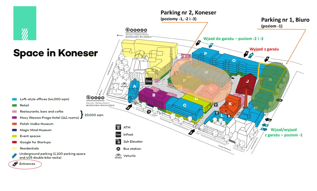 Na piętrze -2 wjazd od ul. Białostockiej (obrazek „Parking nr 2). Dostępny jest parking płatny od poniedziałku do czwartku